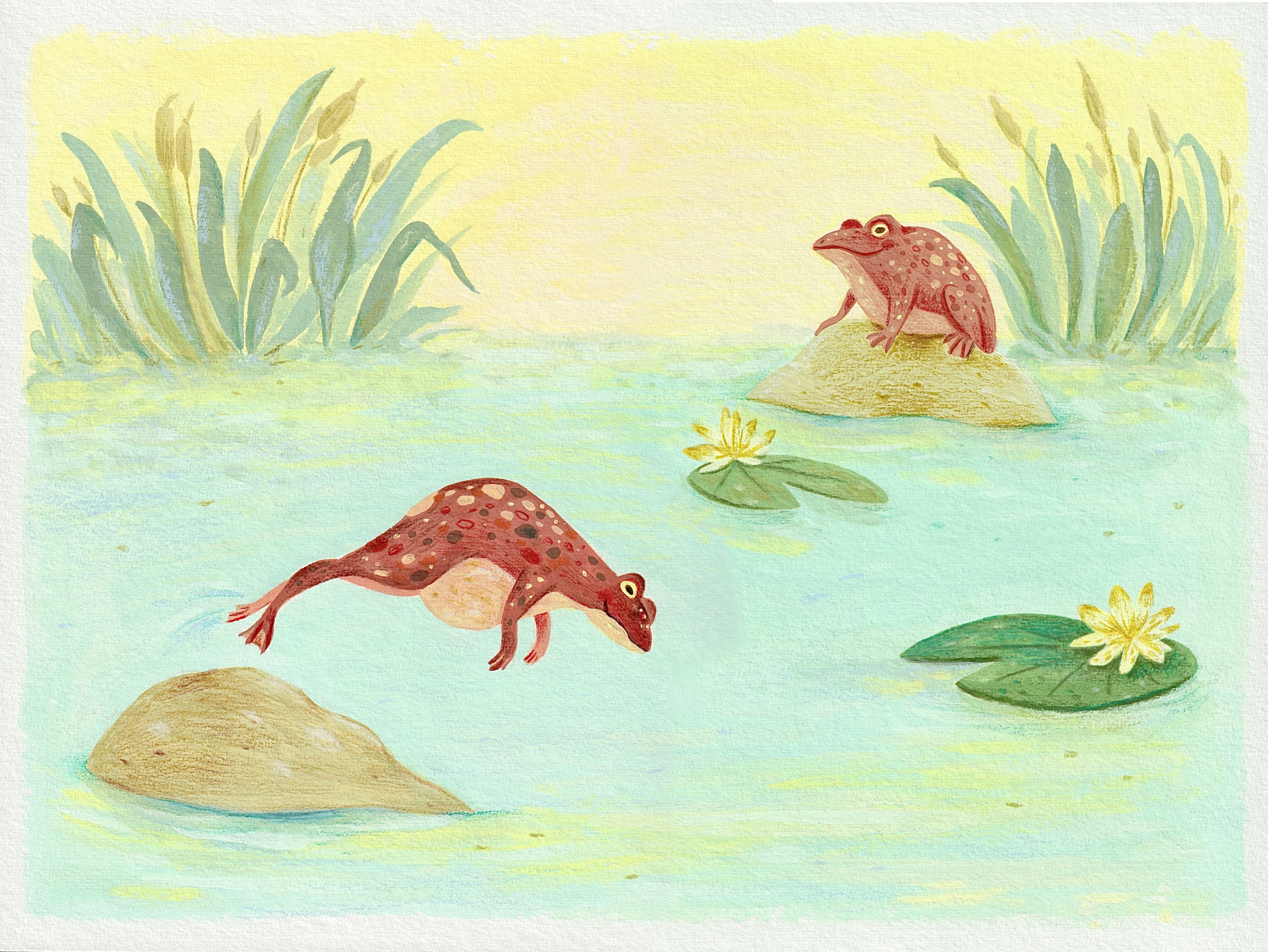 It all started in my sketchbook, with the idea of giving life to a little frog. Then I experimented with its personality and the environment it lives in. From there, I brought it to life using gouache and colored pencils. I’m excited to keep developing Froggy Frog’s adventures and see where it hops next!